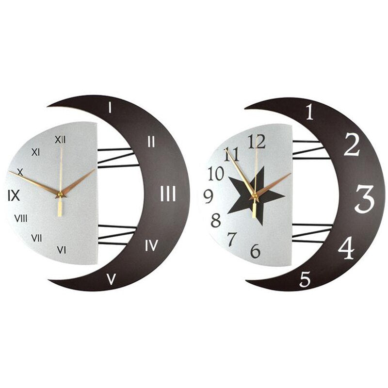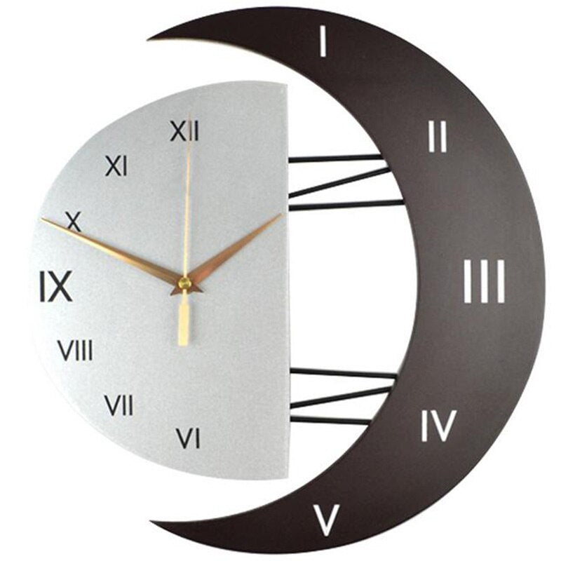 Denne klokken skiller seg ut med sitt innovative design. Den ene halvdelen er en elegant mørk halvmåne med store, klare tall (1-5), mens den andre halvdelen er en lysere sirkel med tallene 6-12 og en stilfull stjerne i midten. De gylne viserne glir lydløst over urskiven, noe som gjør den ideell for soverommet der ro er viktig. Denne halvmåneformede veggklokken er mer enn bare en klokke; den er et samtaleemne og et statement-stykke.